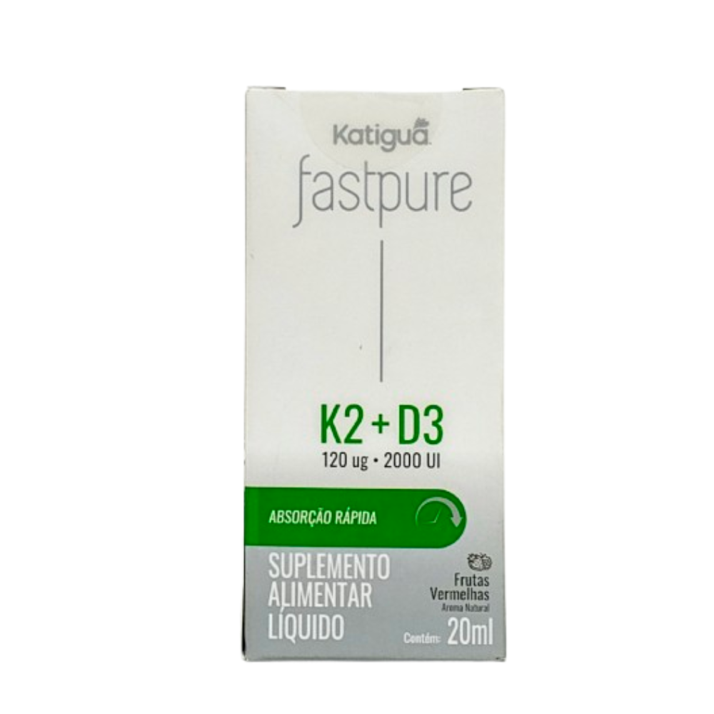 O K2 + D3 Dose Max Fast Pure da Katiguá combina duas vitaminas essenciais — Vitamina K2 (menaquinona-7) e Vitamina D3 (colecalciferol) — em uma fórmula líquida de alta absorção, com delicioso sabor de frutas vermelhas.